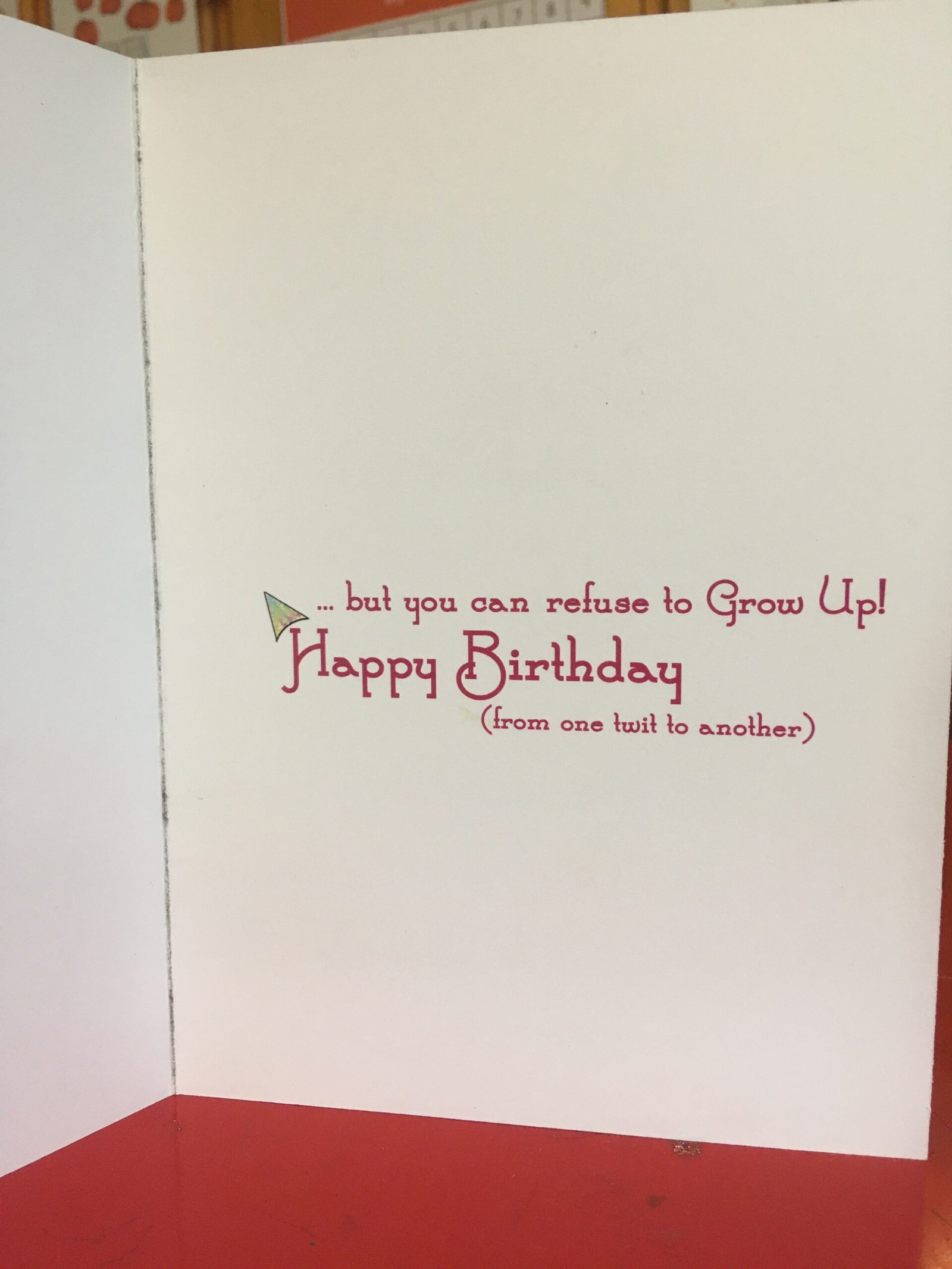 Inside text: but you can refuse to Grow Up! Happy Birthday (from one twit to another)