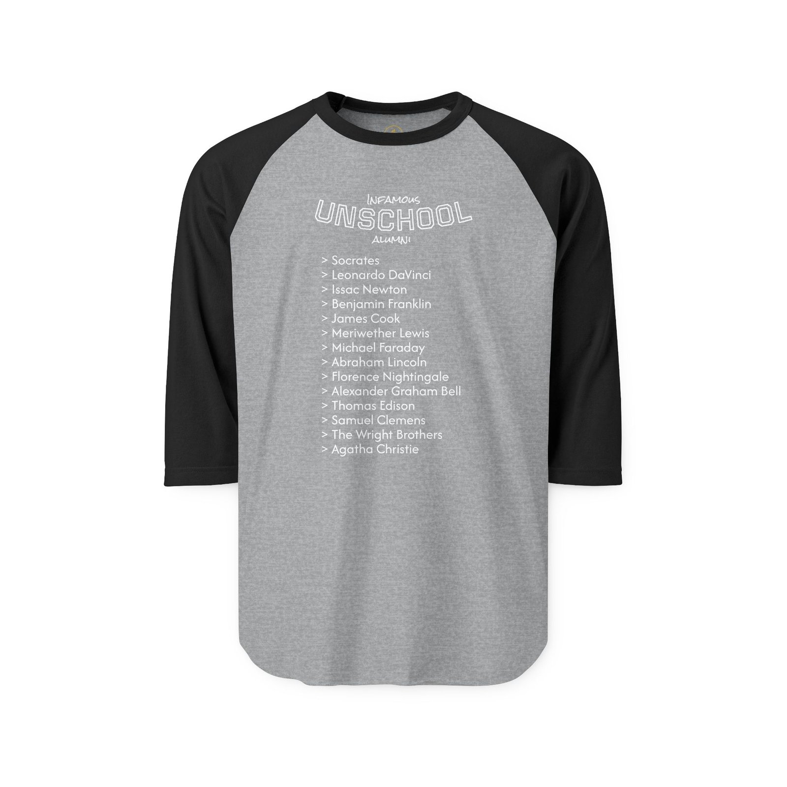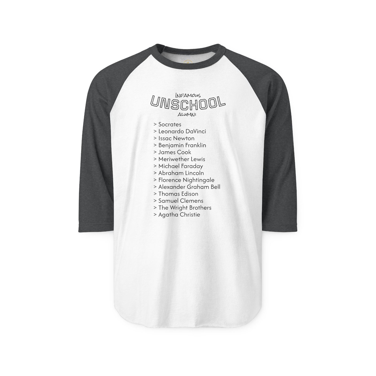 As a homeschool student, you are in good company! Show your homeschool pride with this stylish three-quarter sleeve shirt that lists just a few other notable homeschooled, unschooled, or not schooled historical figures.